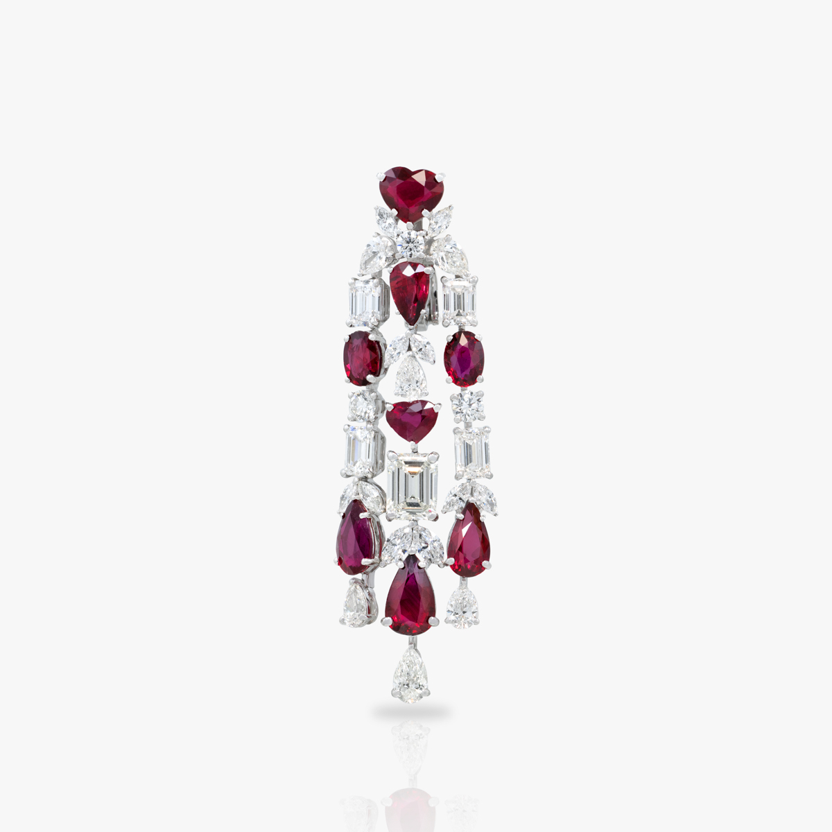 At the heart of "The Devoted Oath" earrings is a stunning heart-shaped lock, fashioned from the rare pigeon blood ruby. Surrounded by marquise, pear, emerald, and round-cut diamonds, these chandelier earrings symbolize unwavering love and devotion.