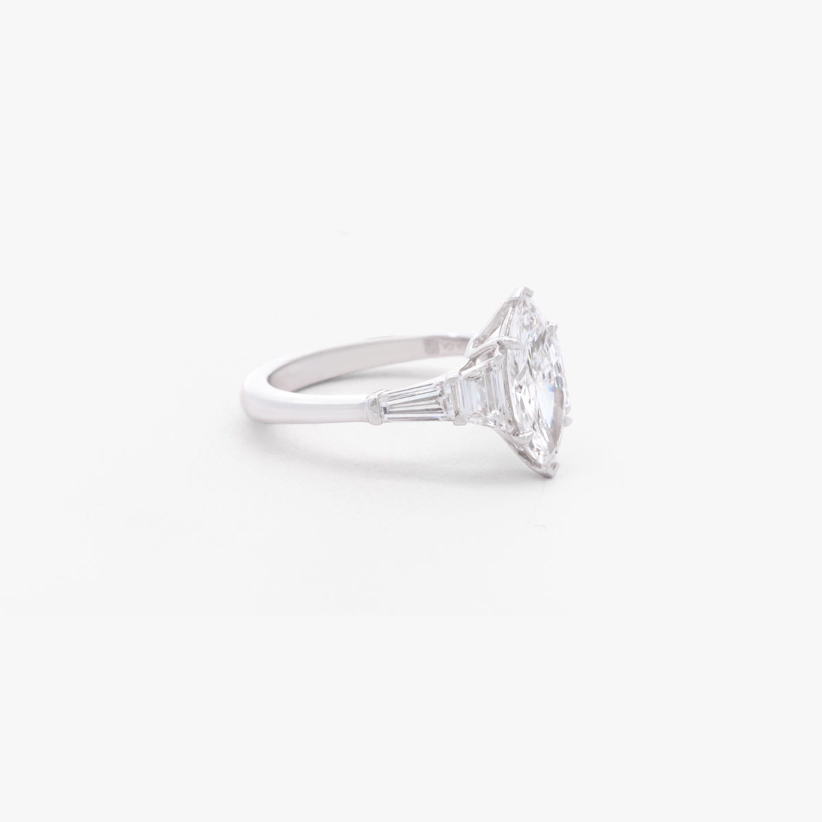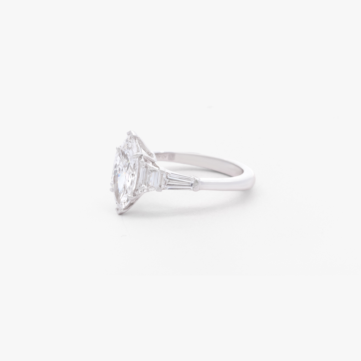 A marquise-cut center diamond flanked by two diamonds reminiscent of the Eiffel Tower, exuding Parisian charm.