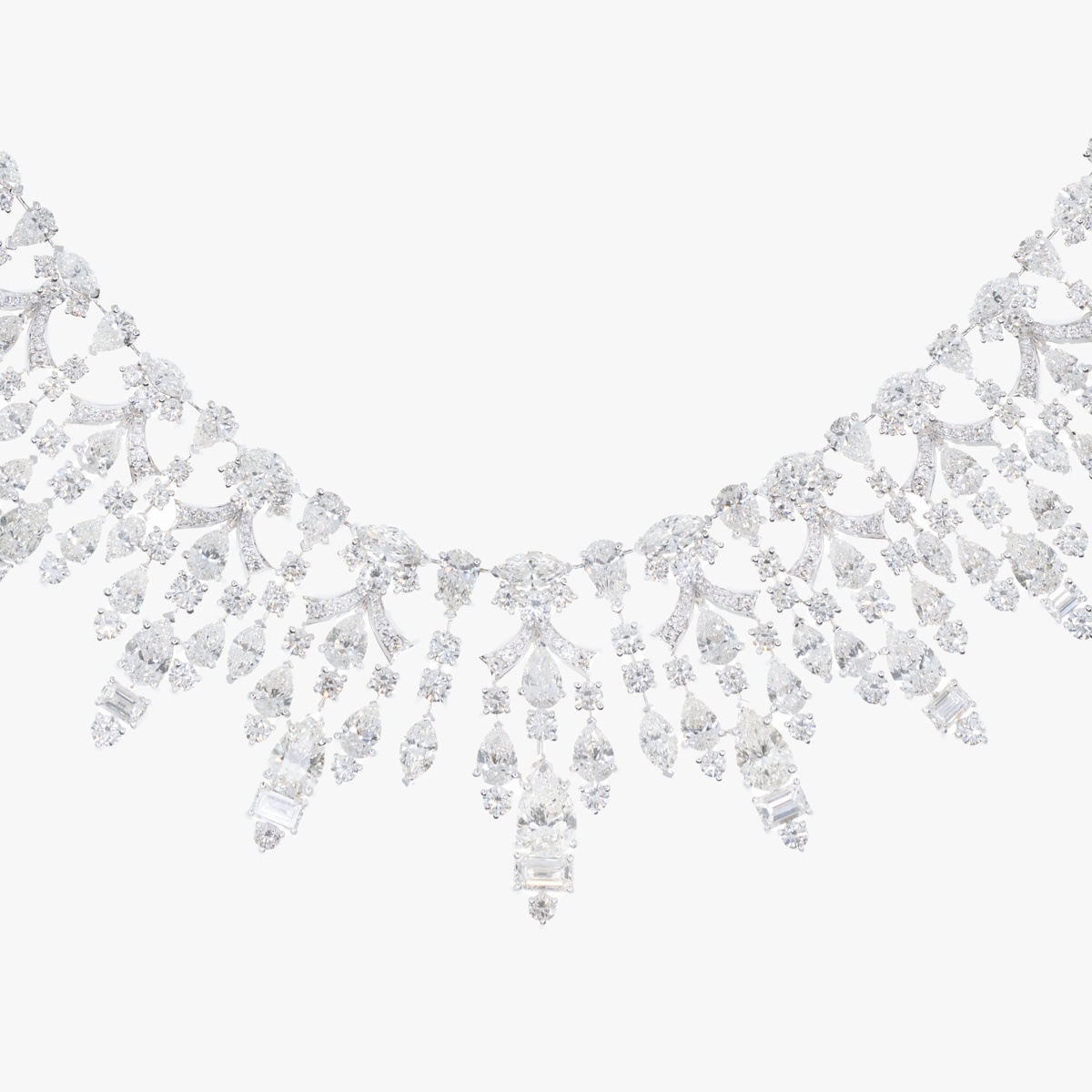 A breathtaking composition of pear, baguette, emerald, cushion, and round-cut diamonds, this necklace radiates a celestial glow, embodying the essence of everlasting brilliance.