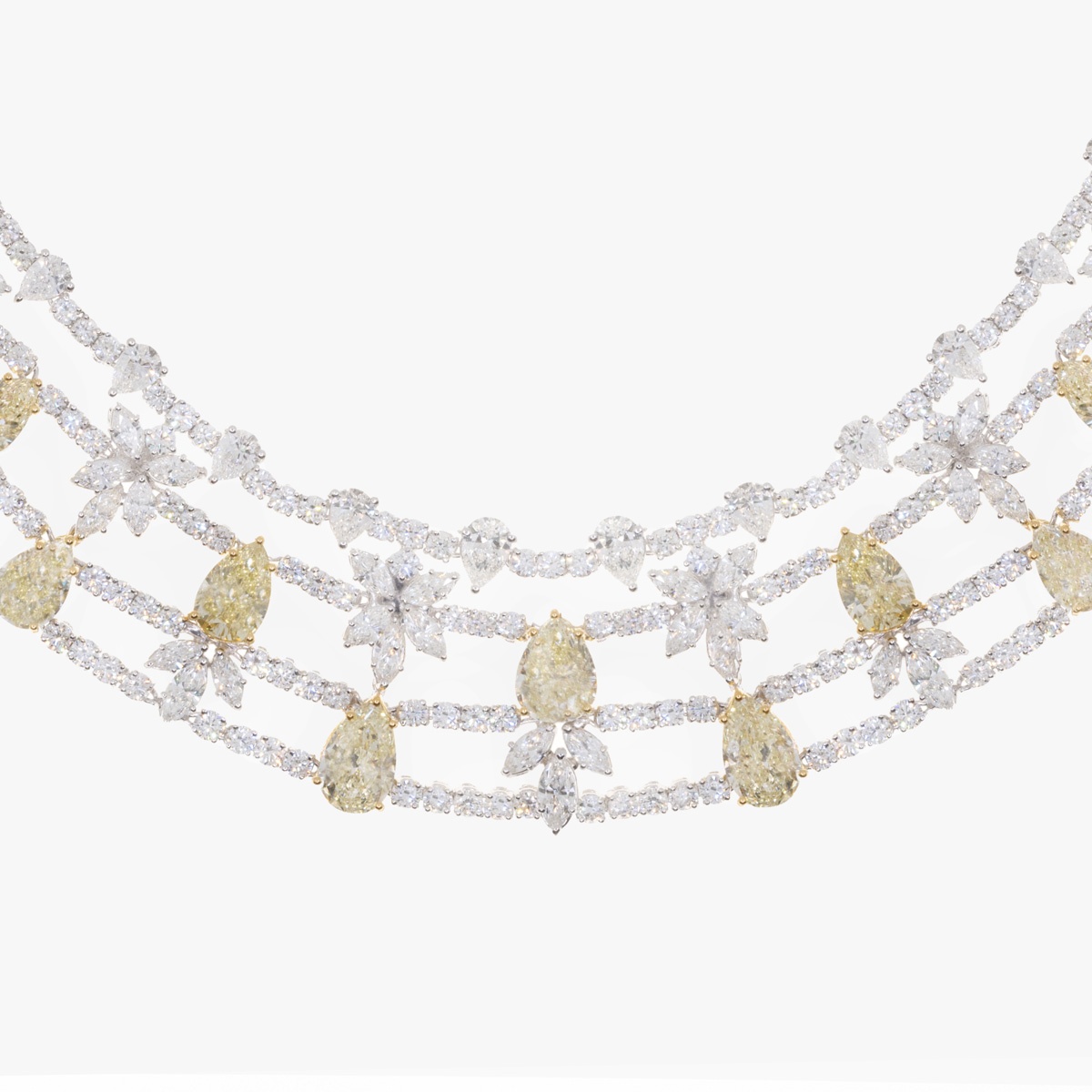 A statement of grandeur, this necklace features an extraordinary combination of yellow pear-shaped diamonds, white pear, marquise, round, and baguette-cut diamonds, arranged to exude a regal sense of luxury.