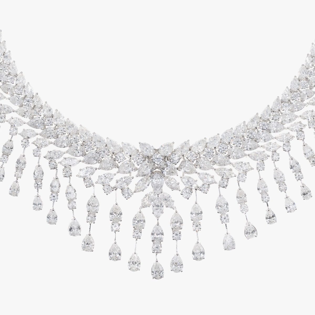 A stunning multi-layered composition, this necklace begins with a delicate pear-shaped diamond layer, followed by round and pear-shaped diamonds arranged in a celestial-inspired pattern, culminating in cascading cushion and pear-shaped drops.